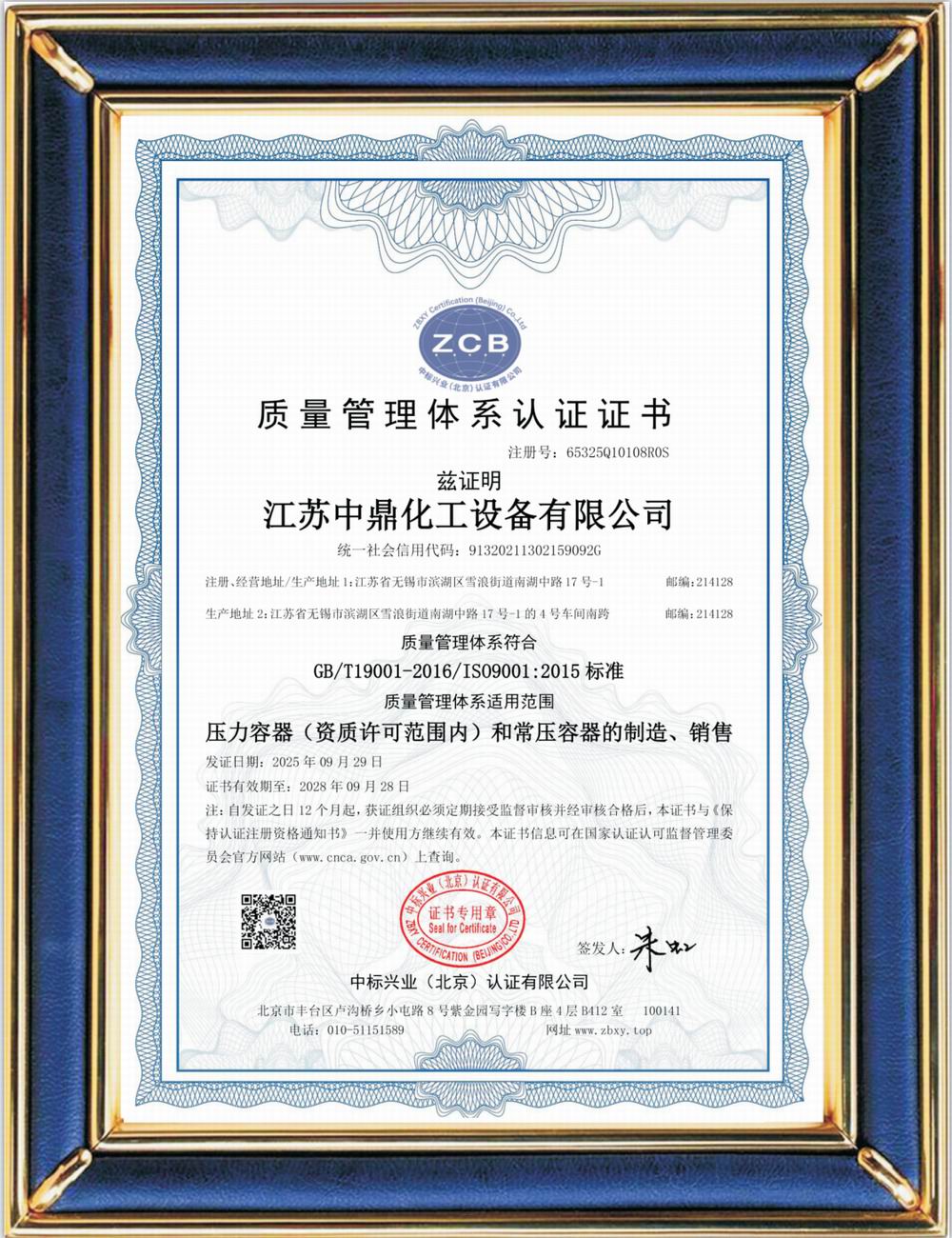 ISO9001質量體系認證證書