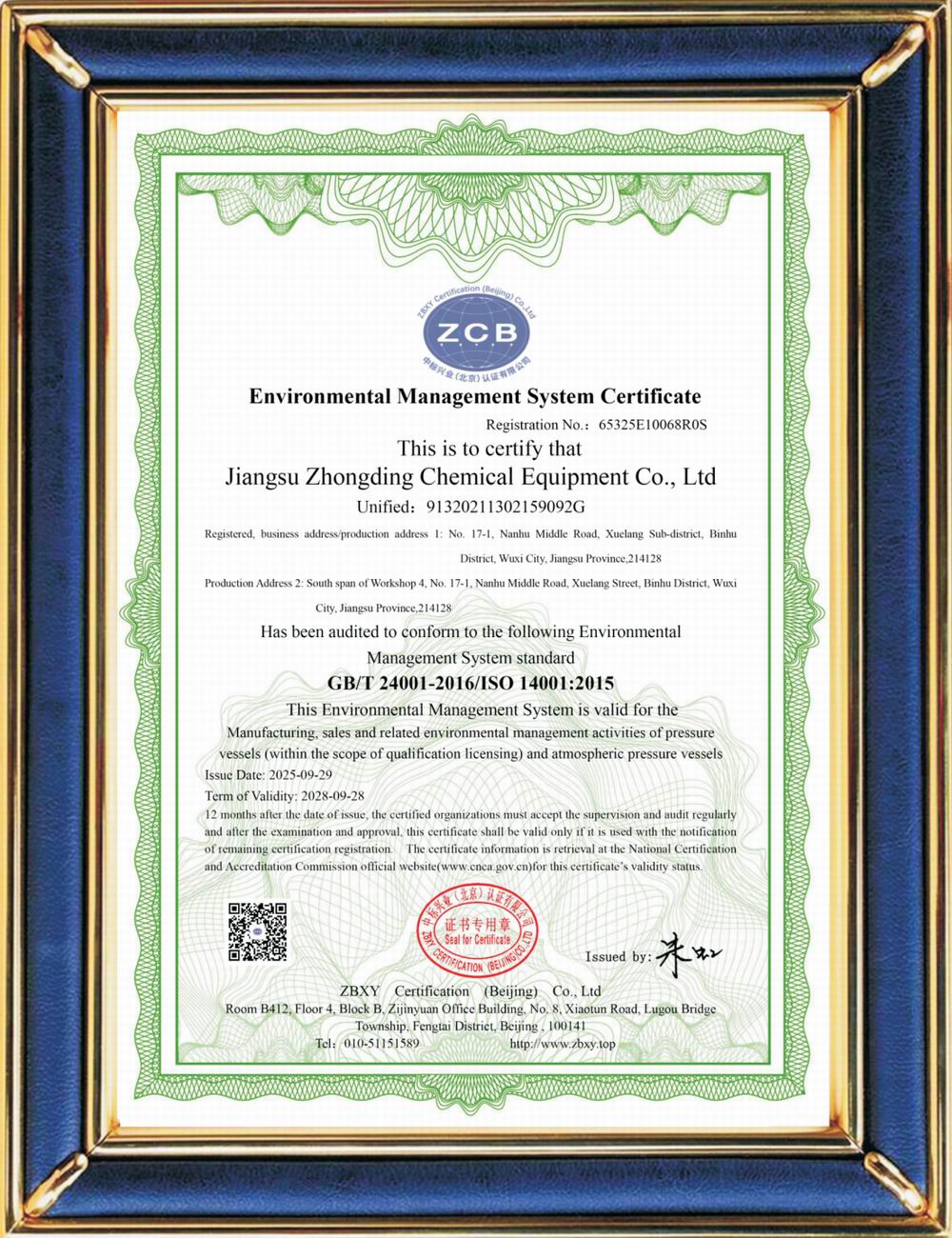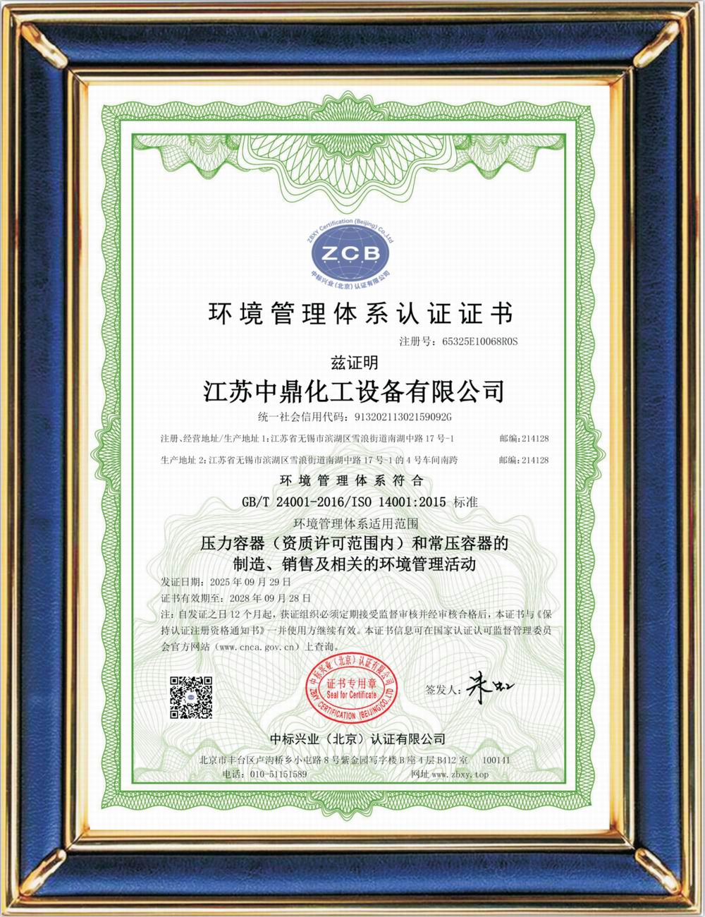 ISO14001環境體系認證證書