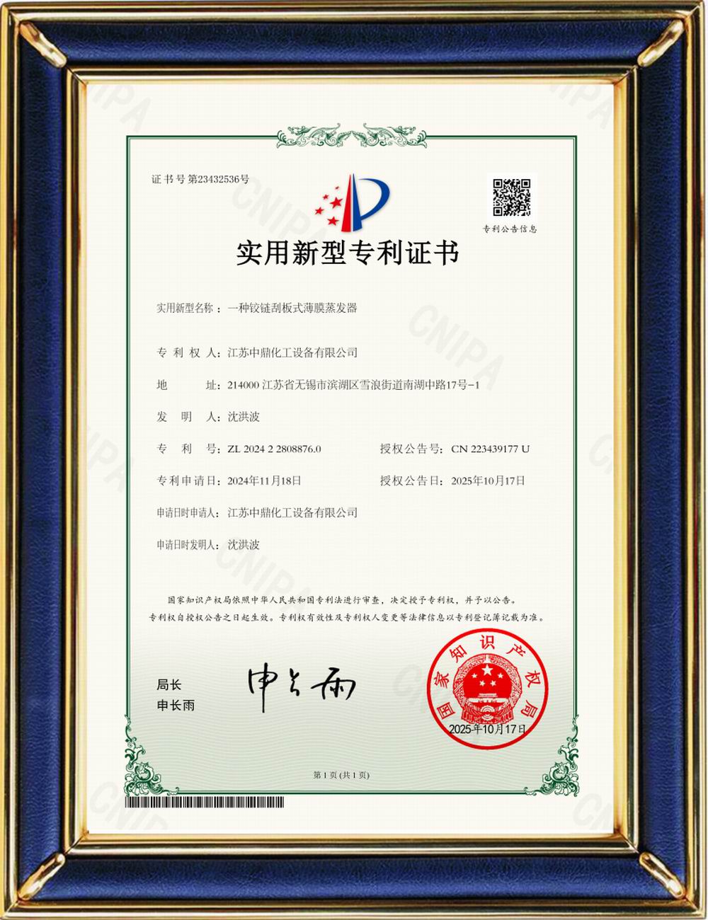 鉸鏈刮板式薄膜蒸發器(專利證書)
