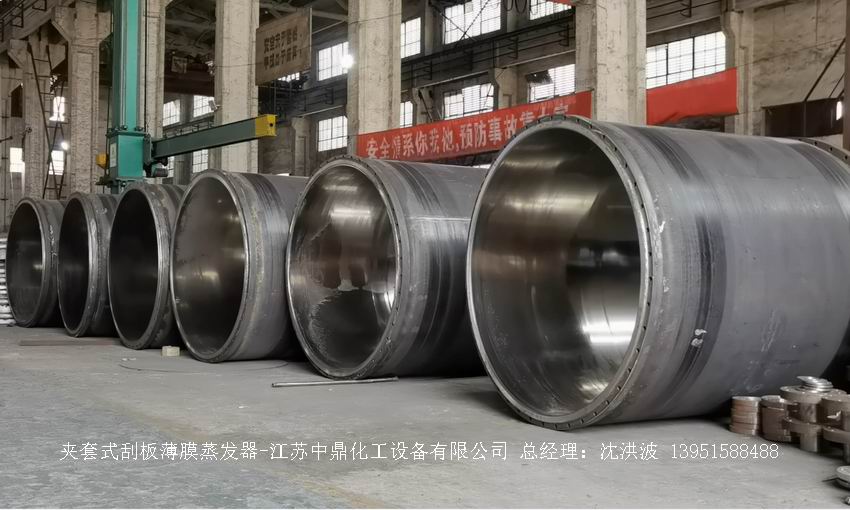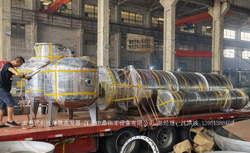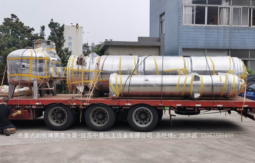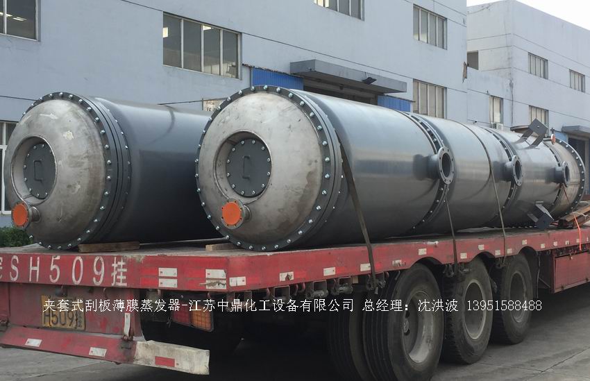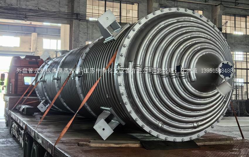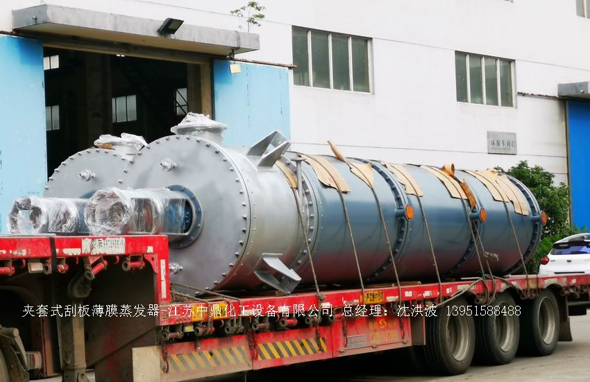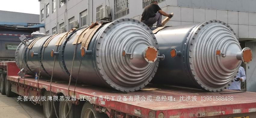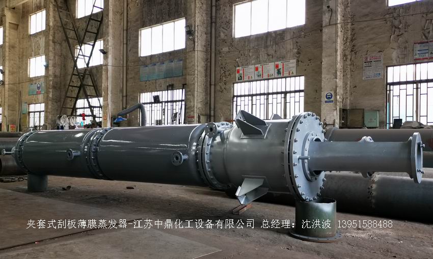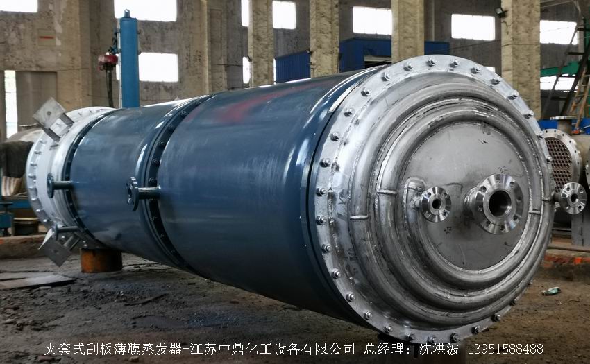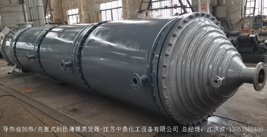 江蘇中鼎化工設備有限公司--離心式刮板薄膜蒸發器主要由加熱外盤半管式夾套(半管夾套內走蒸汽,導熱油,熔鹽或者熱水等循環給蒸發器外壁加溫,通過熱傳導,把蒸發器內壁形成的物料薄膜中的水份蒸發減少,提高物料的濃度百分比。一般設計壓力為0.3mpa~2.5mpa左右,
