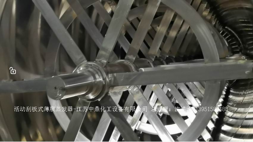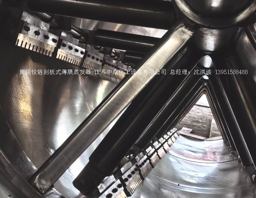 夾套內或者外盤半管內通加熱的熱源,刮板裝在可旋轉的軸上,刮板和加熱夾套內壁保持很小間隙,通常為0.5~1.5 mm。在旋轉時通過離心力,使刮板與內壁緊密接觸。把物料從壁上刮下。料液經預熱后由蒸發器上部進料口沿切線方向噴進,通過液體分布器分散盤把液體均勻分布到蒸發器筒體表面,在重力和旋轉刮板的作用下,均勻分布在蒸發器內壁形成下旋薄膜,并在下降過程中不斷被蒸發濃縮,完成液由底部排出,二次蒸汽向上從頂部倉逸出(一般通過真空泵抽出)二次蒸汽再通過汽液分離器、冷凝器處理。在某些場合下,這種蒸發器可將溶液蒸干,在底部直接得到固體產品。這類蒸發器的缺點是結構復雜制造\安裝和維修工作量大。